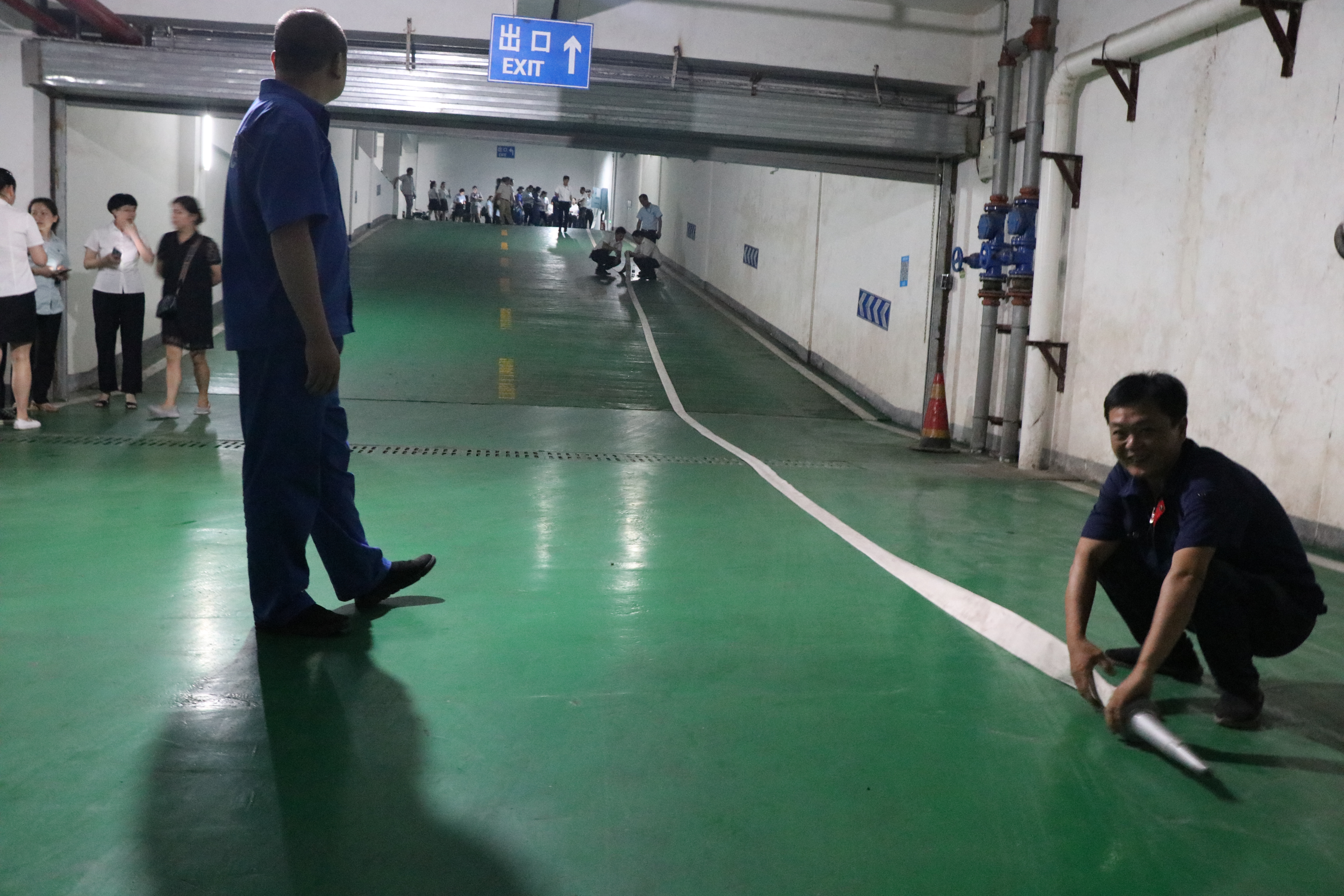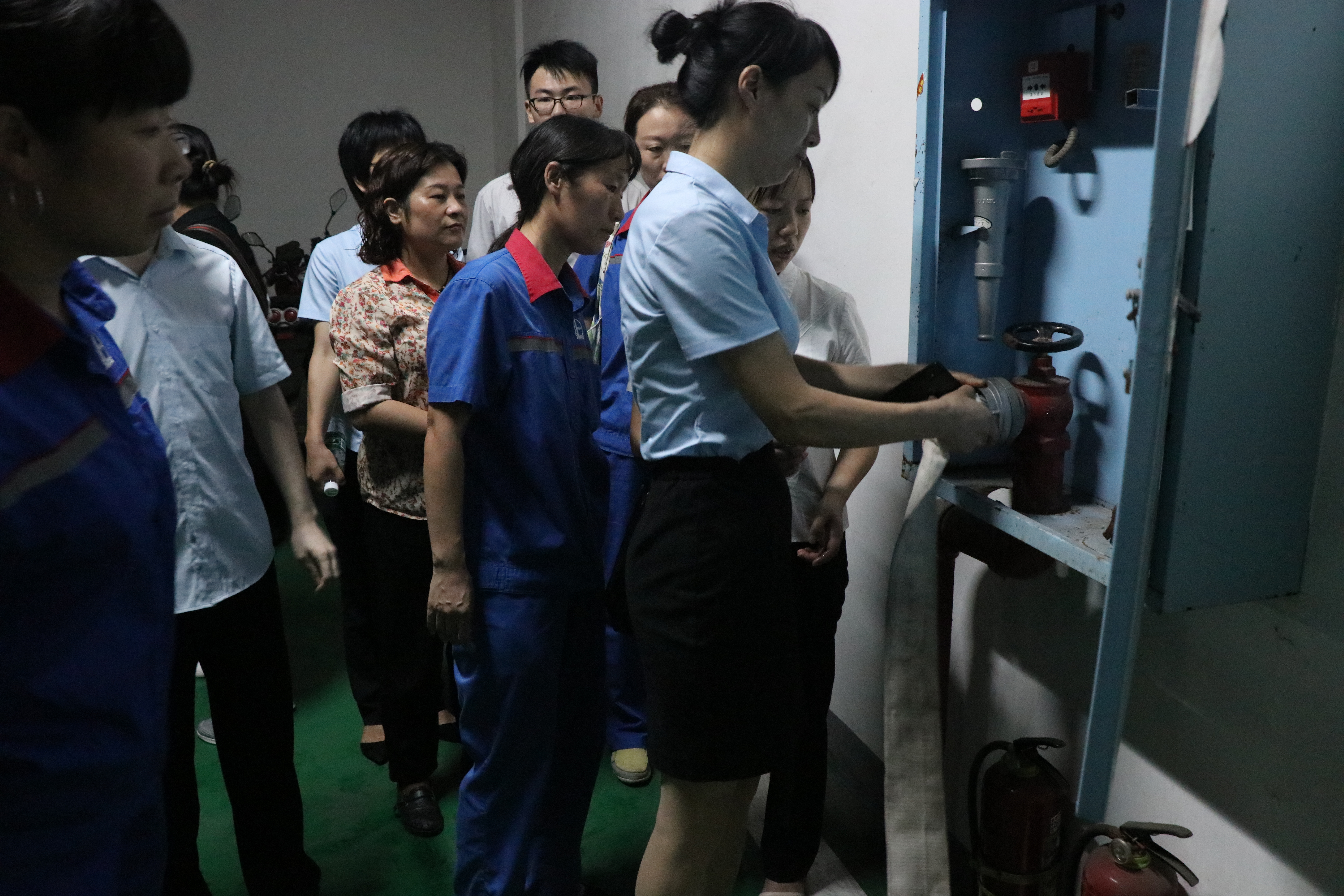 安全指導(dǎo)員邊講解邊示范操作,如何正確使用消火栓內(nèi)啟動(dòng)消防泵及水帶連接滅火的操作。