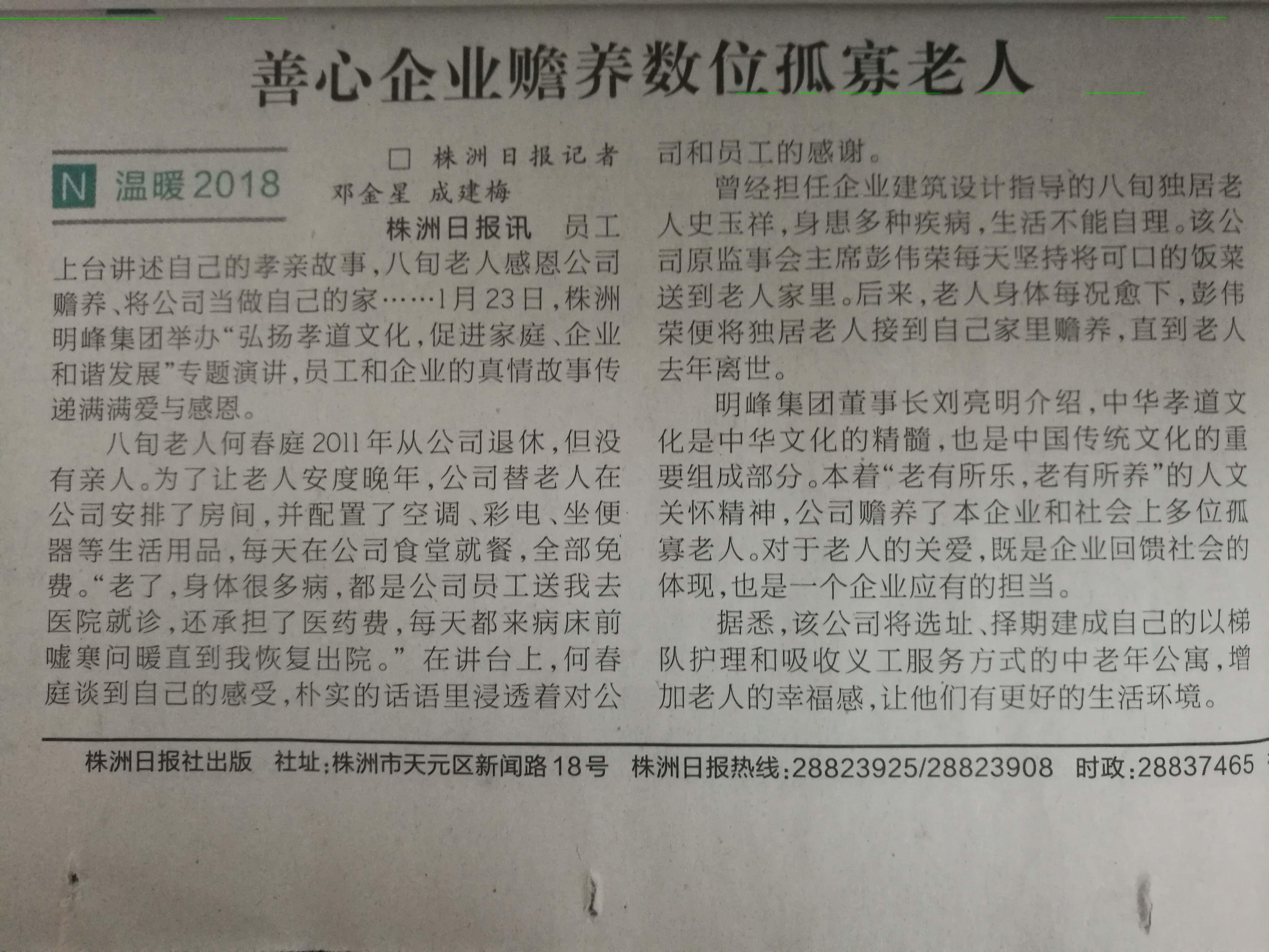 2018年1月24日株洲日?qǐng)?bào) 報(bào)道善心企業(yè)——株洲明峰集團(tuán)贍養(yǎng)數(shù)位孤寡老人